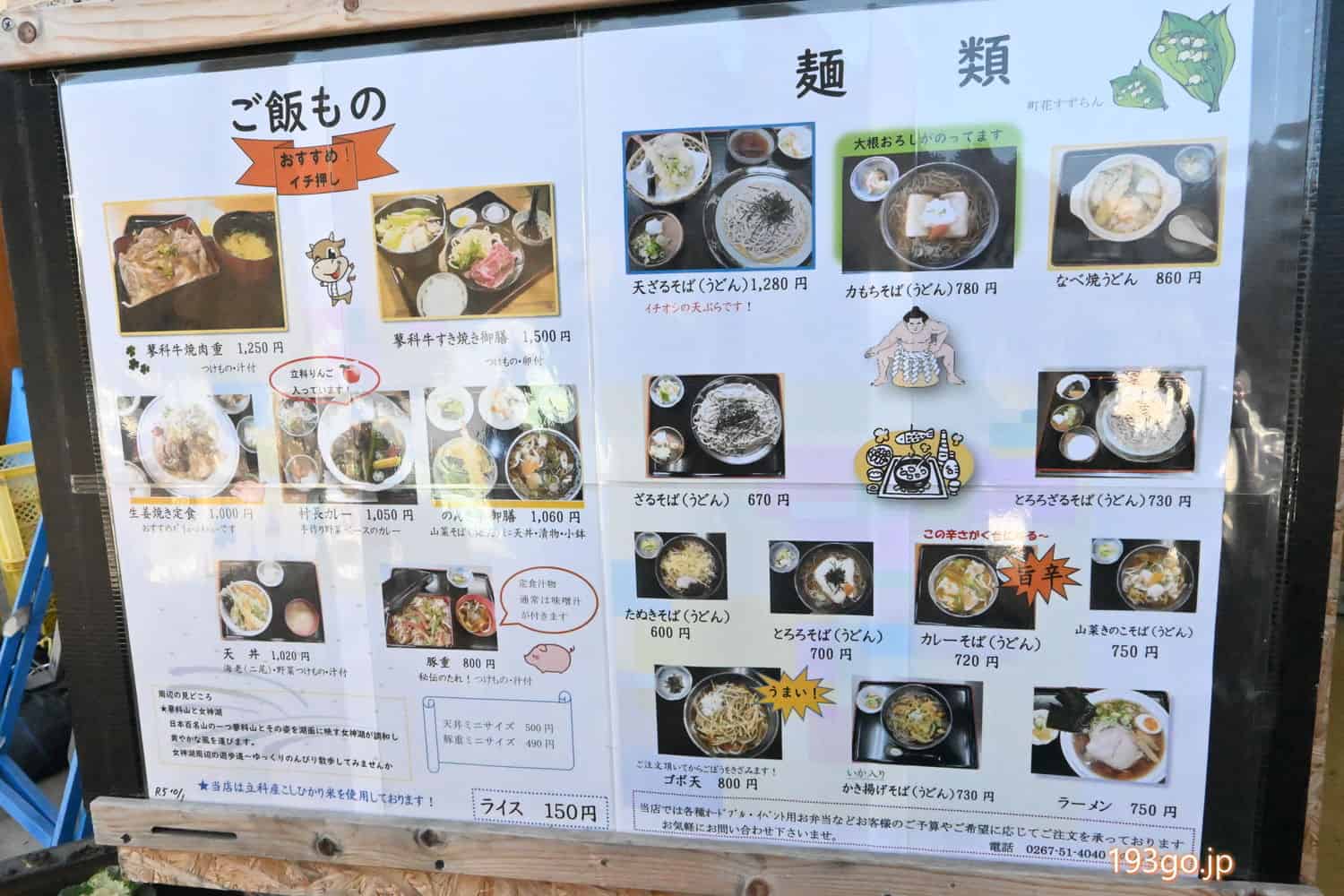 メニューは蓼科牛すき焼き御膳や、村長カレー、力もちそば、鍋焼きうどんなど。