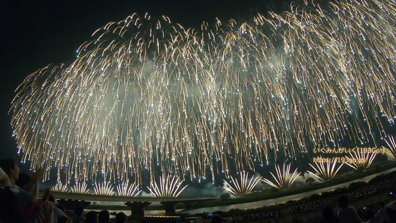 最後のプログラム「米百俵花火・尺玉100連発」。フィナーレにはフェニックスに継ぐくらいのワイドに広がるスターマインが豪華で見ごたえあり!