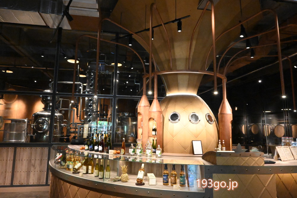 パイン型の蒸留機をモチーフとしたオブジェが特徴的なバーカウンターが備わり、開放感ある空間。