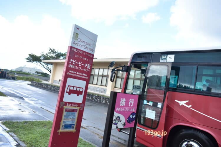 沖縄エアポートシャトル 運行のリゾートライナー(赤色のバス)でナビービーチ前(恩納村コミュニティセンター)下車。