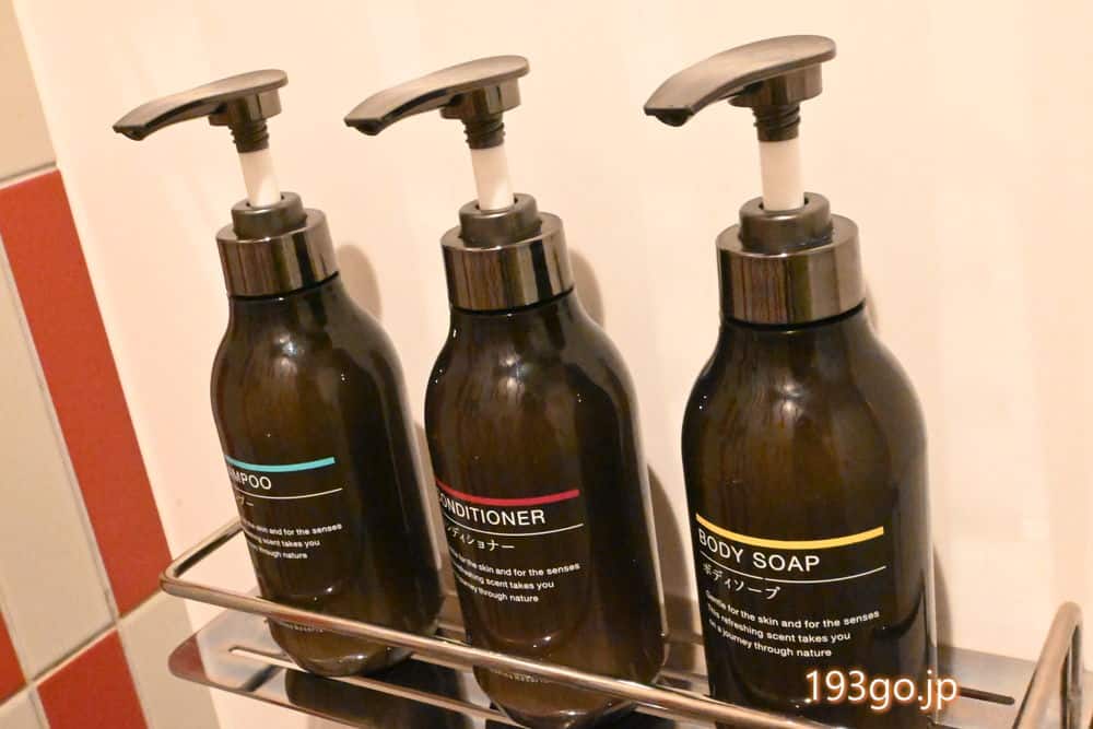 ハンドソープ、シャンプー、コンディショナー、ボディソープが設置。
