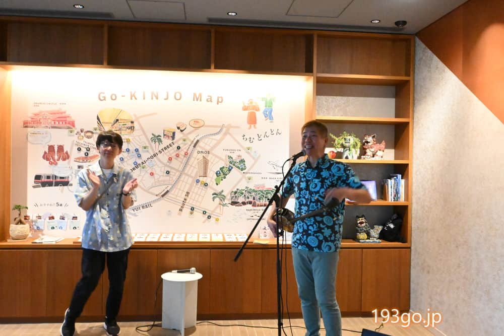 夕方、ラウンジで三線ライブ(生演奏)。宿泊者が集まり、盛り上がっていた。
