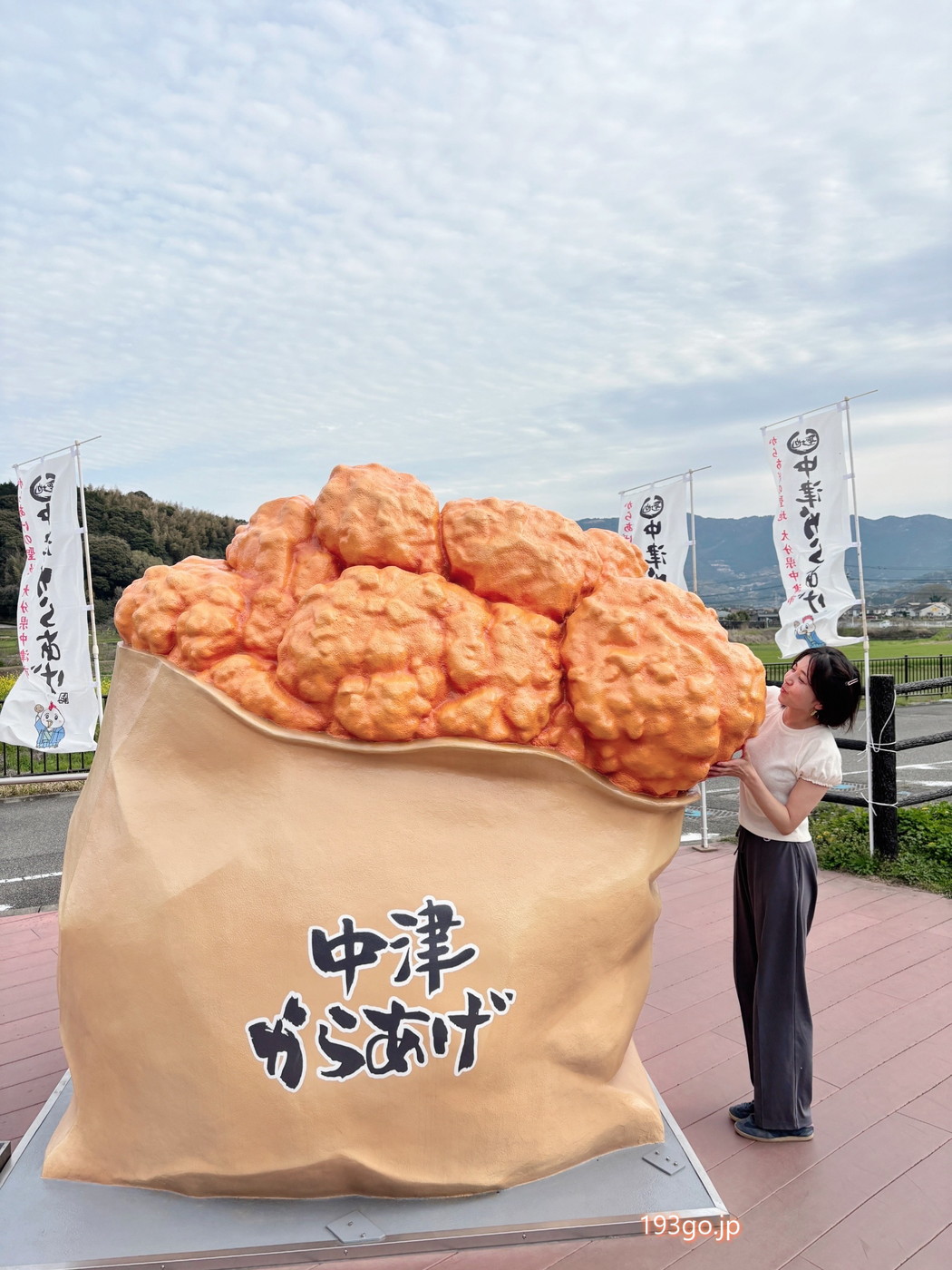 巨大な唐揚げモニュメント側の駐車場に止めると、