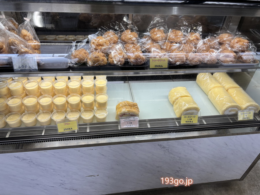 卵、鶏肉、プリン、ロールケーキなどが販売されていて、