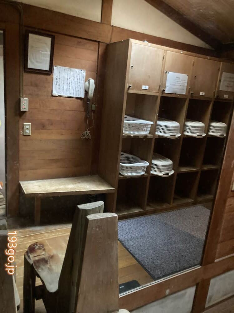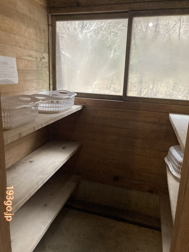 脱衣場には、脱衣かごと、ドライヤーが1つ。洗面台や水道などはない。備え付けのバスアイテムはないが、洗い場のお湯を汲んで、シャンプーは行って良い様。