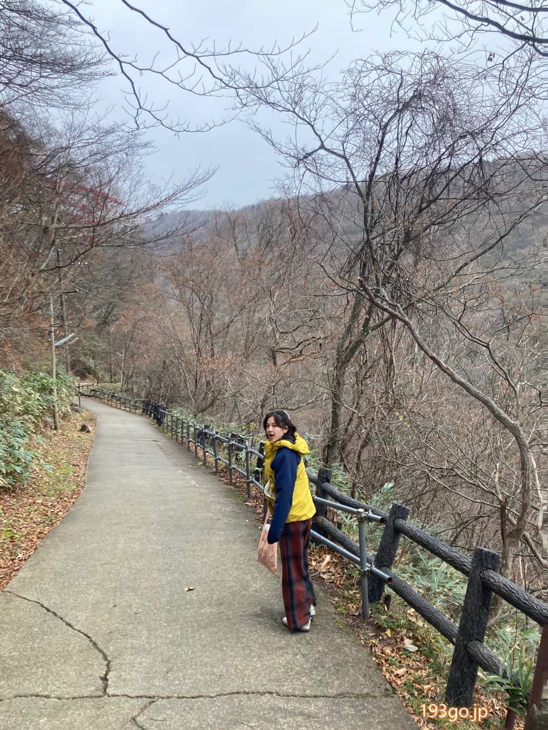 駐車場に車を止めたら、ここからは徒歩。坂道を下っていく。
