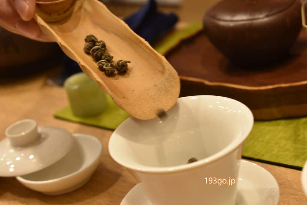この日は黄(こう)さんが目の前でお茶を淹れてくれ、色々なお話を聞きながら白芽奇蘭烏龍茶(はくがきらんうーろんちゃ)、茉莉龍珠(まりりゅうじゅ)などを試飲した。