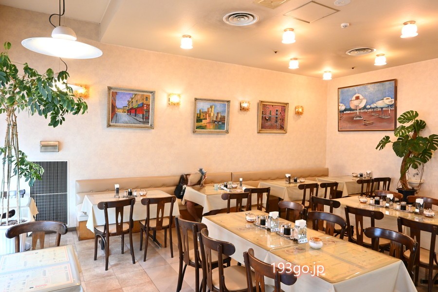 店内には絵画が飾られ、広々。テーブル席が並んでる。