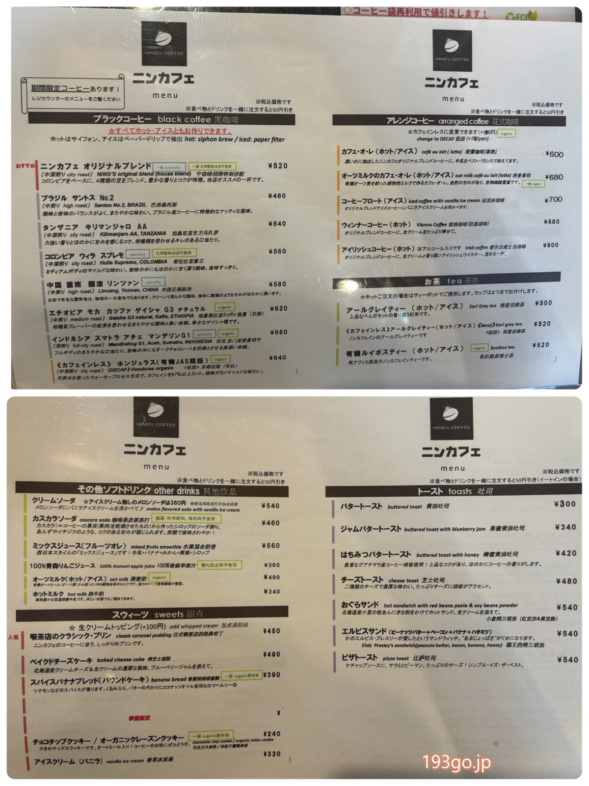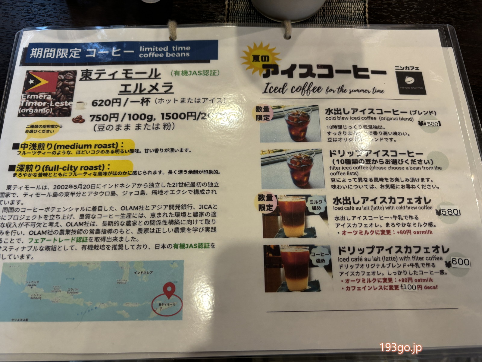 メニューはオリジナルブレンドをはじめとしたコーヒー各種、