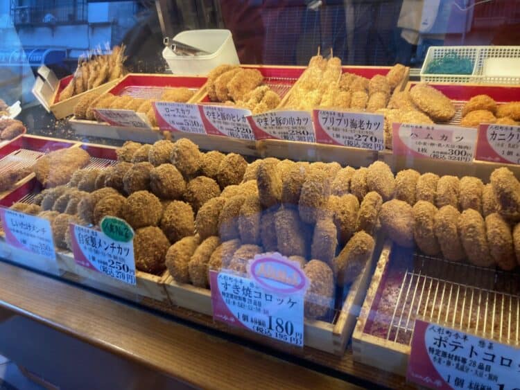すき焼き(弁当)しか食べたことが無かったけど、ここでは惣菜が売られてて店内に列が出来るほどだったので、一緒に並んで牛肉コロッケやメンチカツをゲット。^^