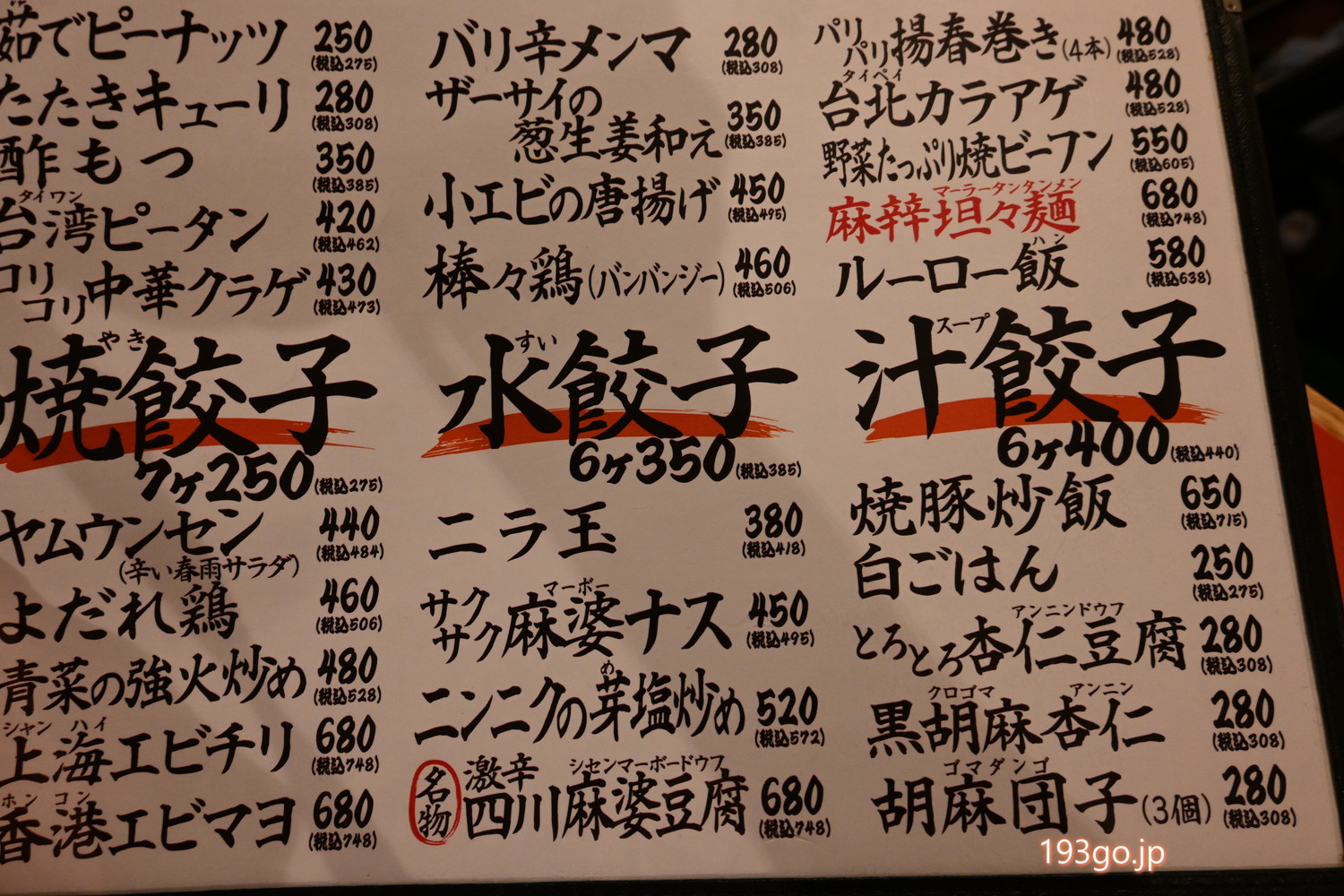 メニューは焼き餃子、水餃子、汁餃子の他、ヤムウンセンやよだれ鶏、エビチリ、青菜炒め、四川麻婆豆腐、麻辣担々麺、台北からあげなど中華中心の一品料理が揃う。