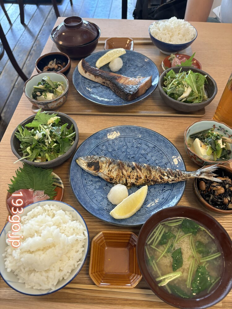 お盆にメインの焼き魚と、刺身、サラダ、小鉢、ご飯とみそ汁。