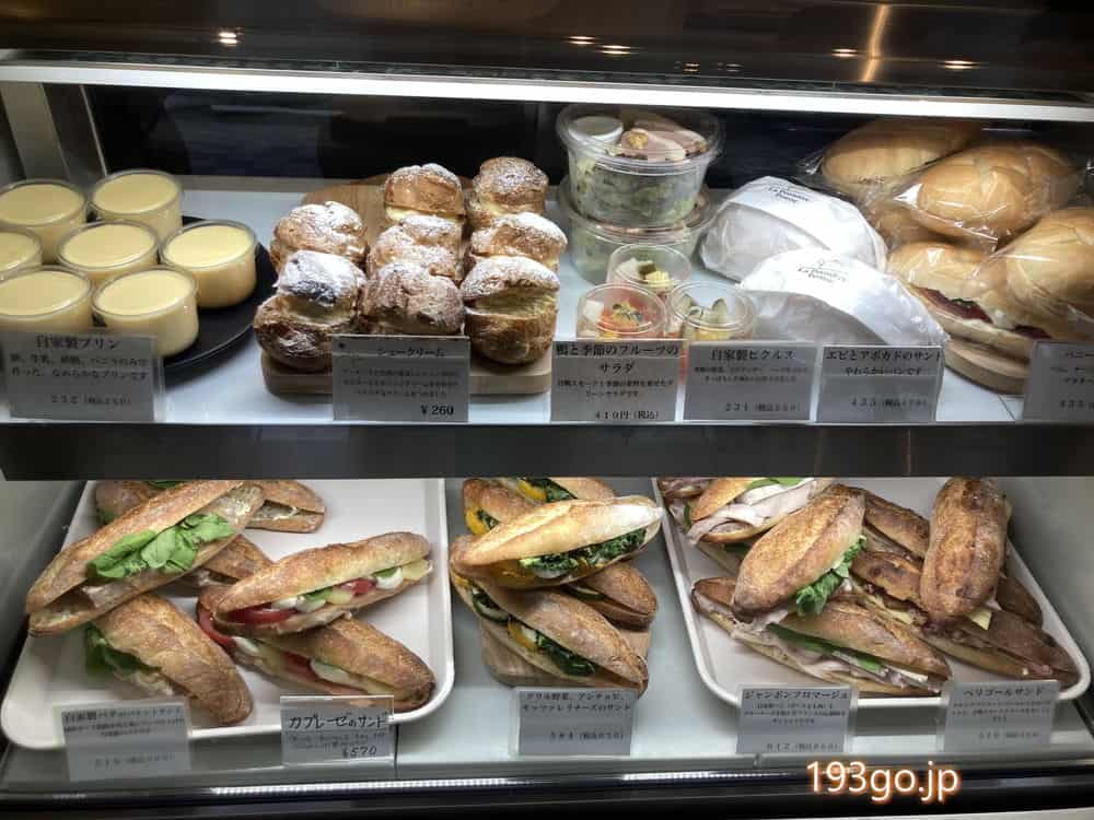 ショーケースにはバゲットサンドイッチ、シュークリーム、プリン、自家製ピクルス、フルーツサラダなどが並ぶ。