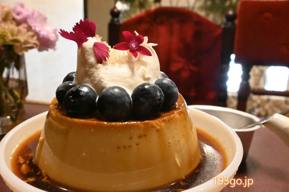 プリンの上にはブルーベリーが並べられ、ホイップクリームと食用花、シュガーがトッピング。
