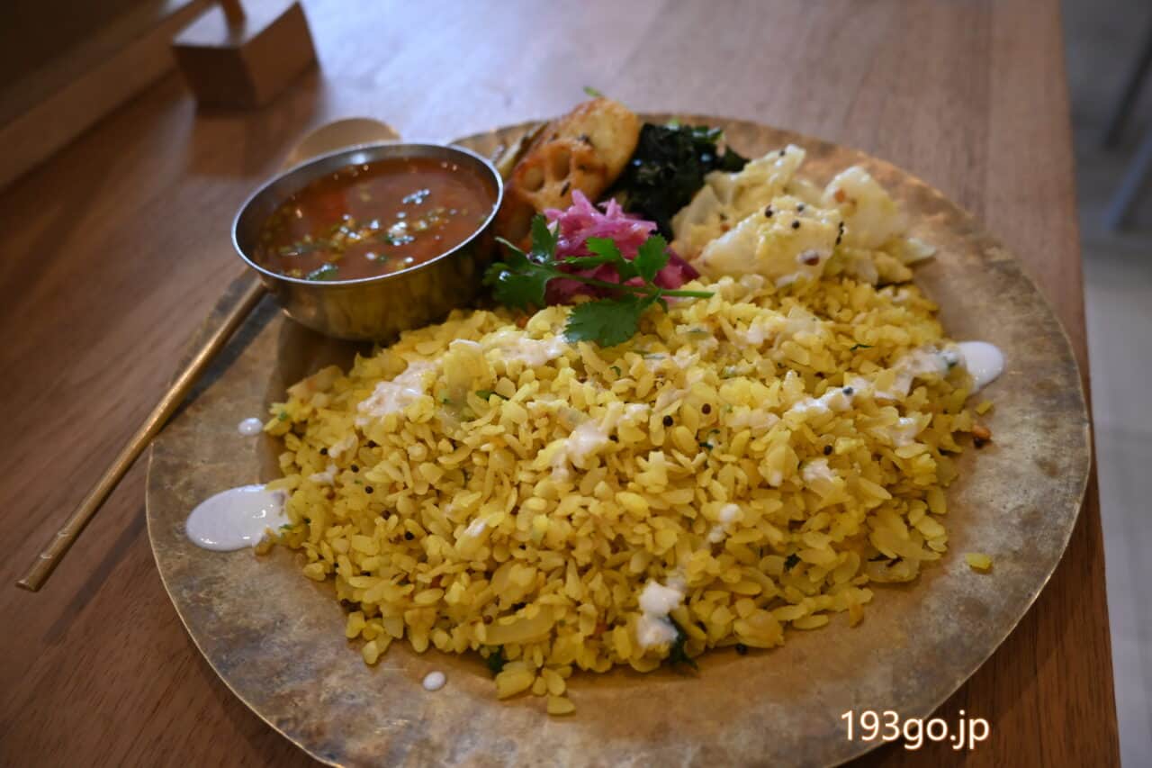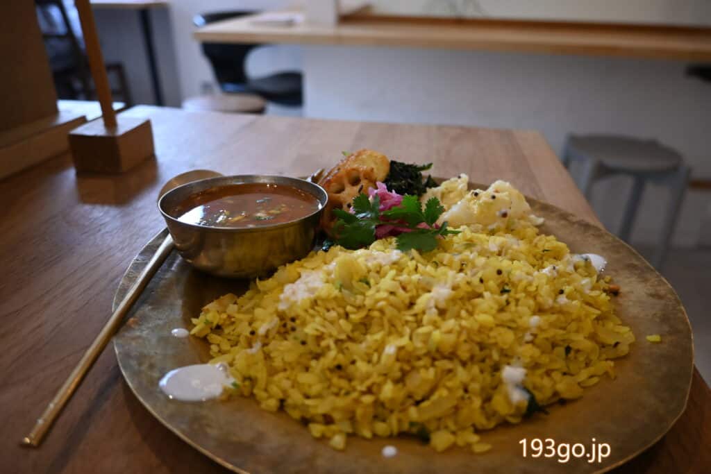 インドの朝食「ポハ」パラパラライスに彩り野菜 ラッサムとアツアツチャイ付き