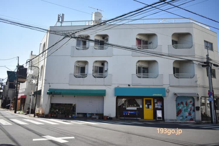 交差点のコーナーに、カラフルなシャッターの隣で、ブルー&イエローの外観。