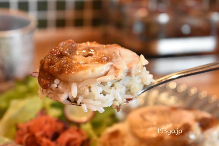 鶏だしの旨味が効いたパラパラのジャスミンライスにナンプラーも垂らしスプーンは止まらず、完食。