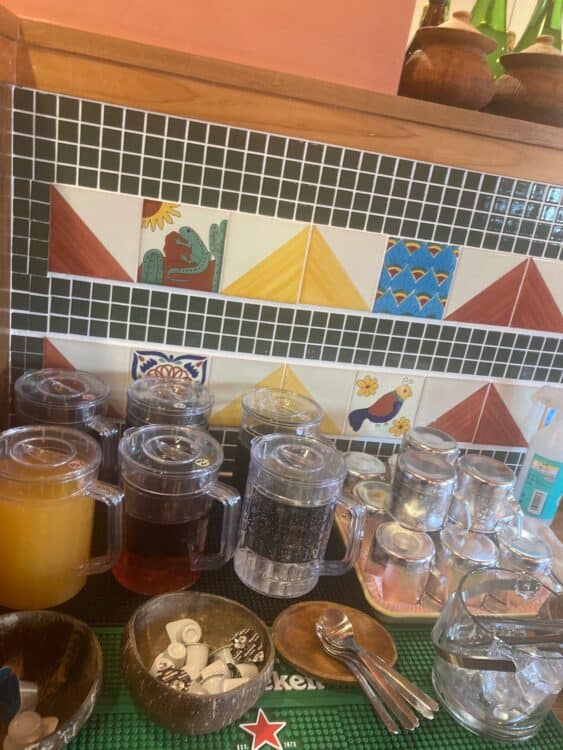 アイスティー、アイスコーヒー、ルイボスティー、オレンジジュースなどがあり。