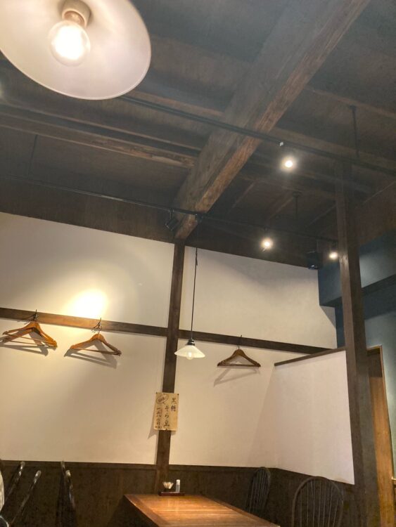 木の温もりがある店内、ランプがぶら下がった和空間。