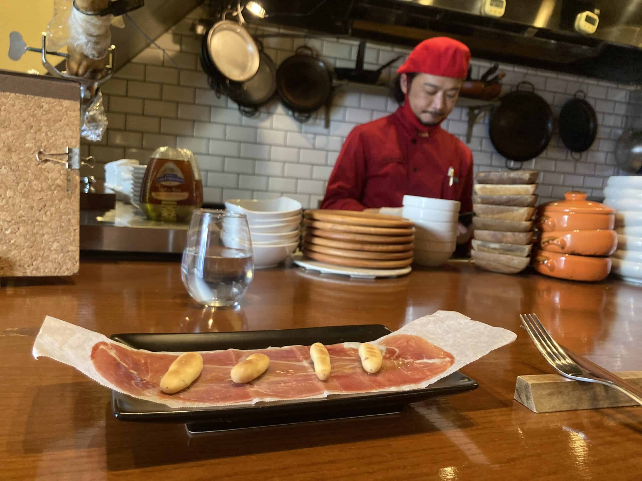 赤い帽子に赤いシャツ、赤いマスク。赤で統一した衣装のひげを生やしたスペインが似合う日本人シェフが立っていた。