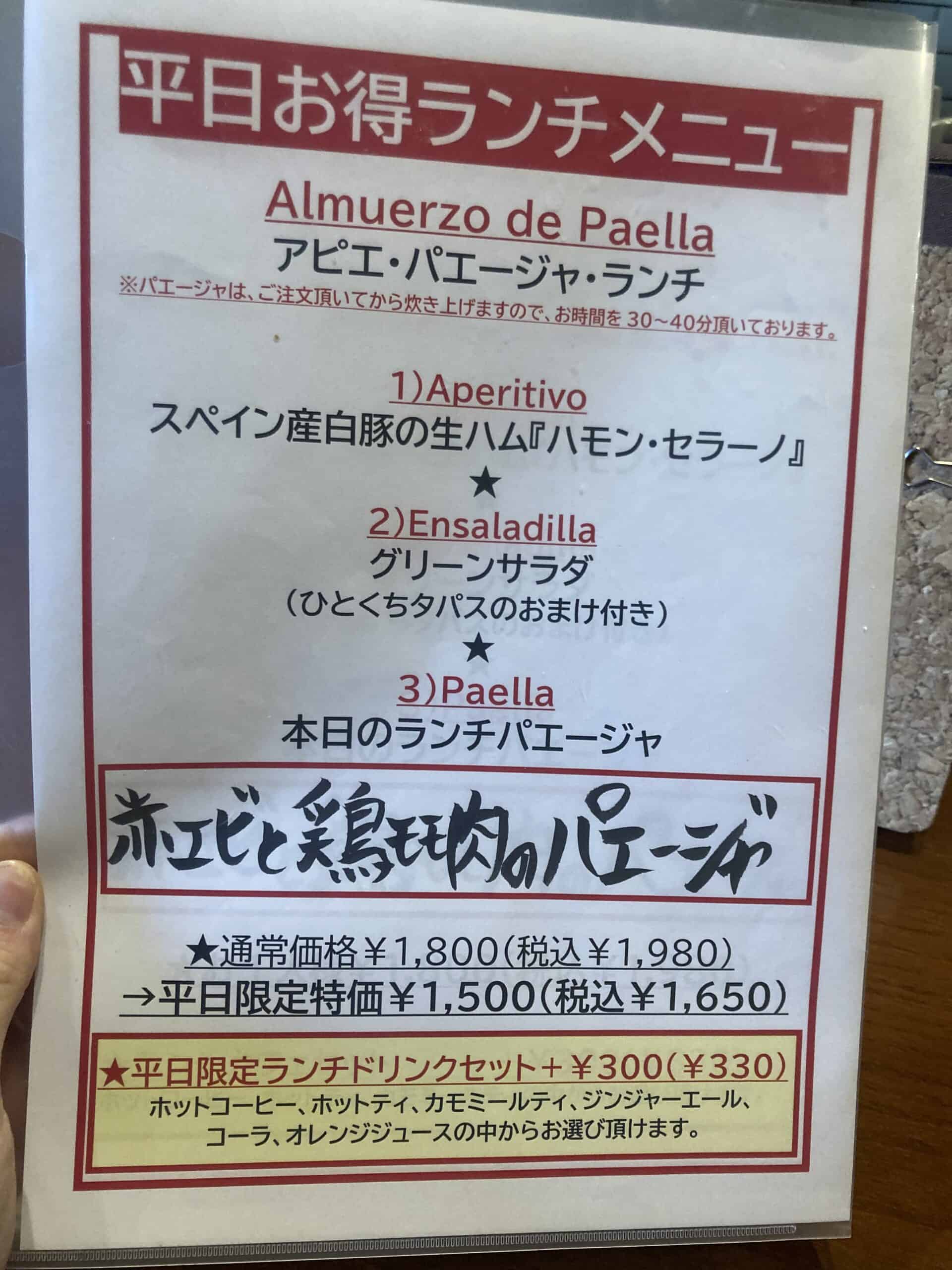 西荻窪駅南口から2~3分にあるスペイン料理「アピエ」の前を通ると、なんと平日ランチ限定でパエージャ(パエリア)が1,500円(税抜)ではないか!(通常1,800円)