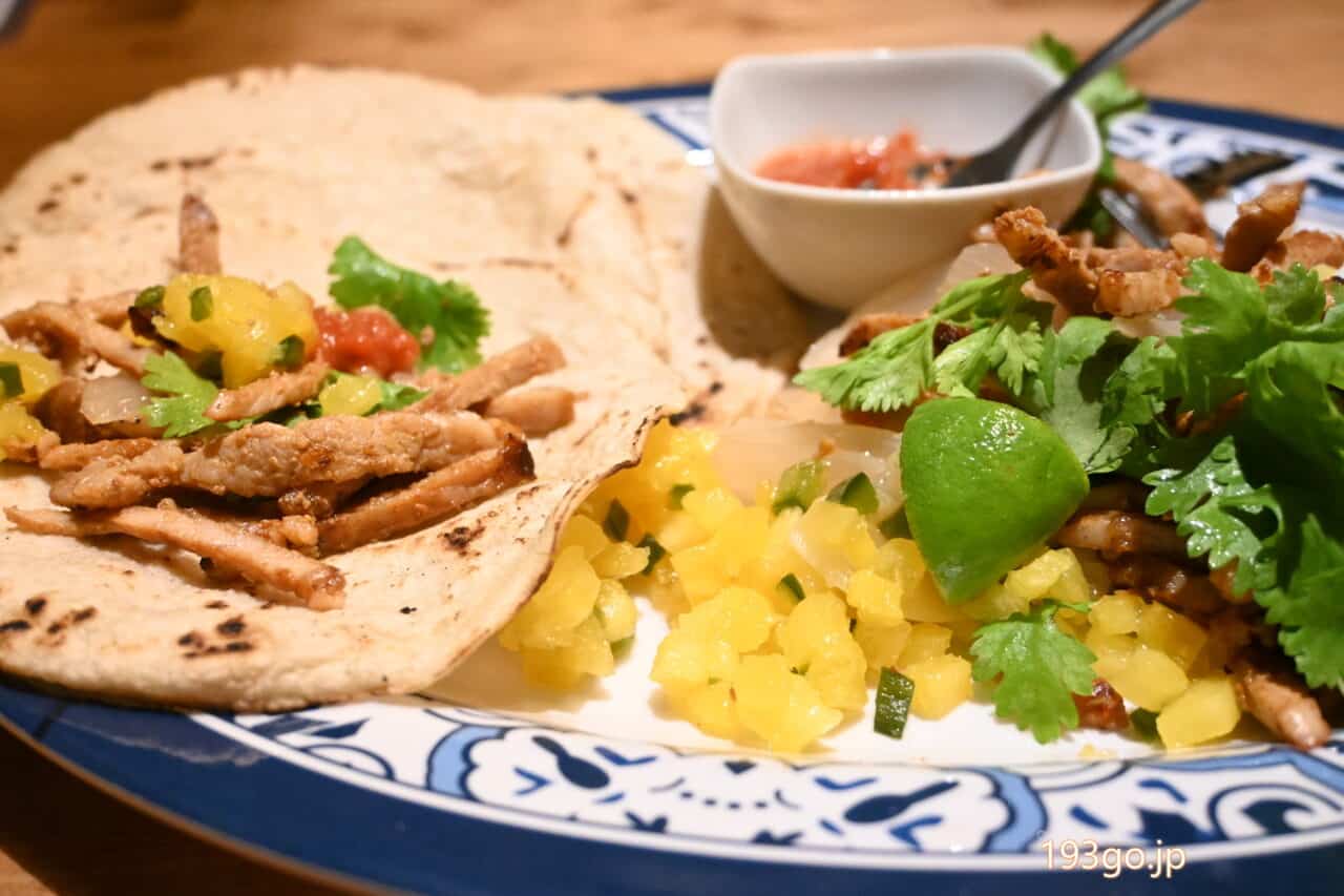 トルティーヤ3枚、チレ、野菜、香辛料漬け豚ロース焼き、炒め玉葱、パイナップル、ライム、パクチー、サルサ付き。