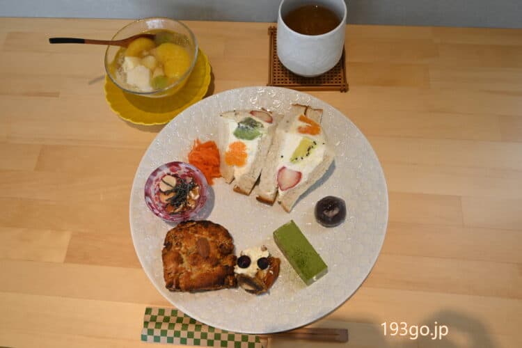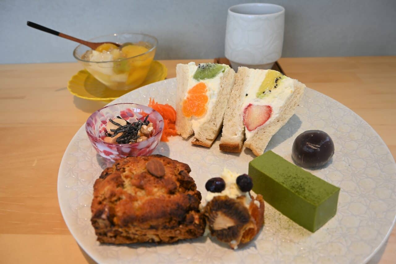 ワンプレートに、フルーツサンドと、水まんじゅう、抹茶ムース、選んだスコーン&クロテッドクリーム、キャロットラペ、ナッツ&塩昆布。