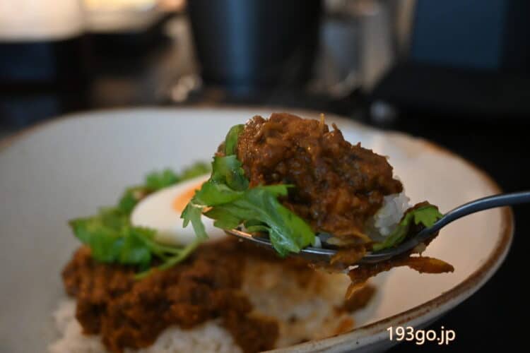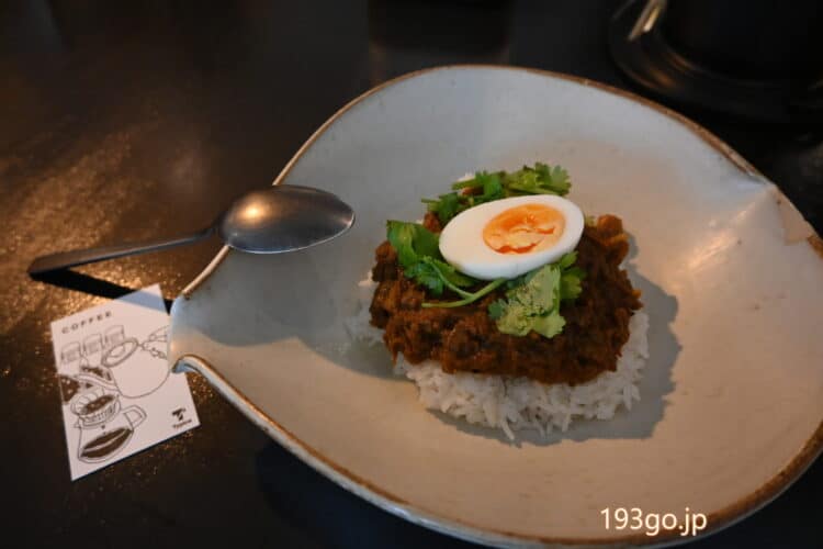 カレーはユニークな形をした深めのお皿に。ひょうたん型みたいで可愛い。