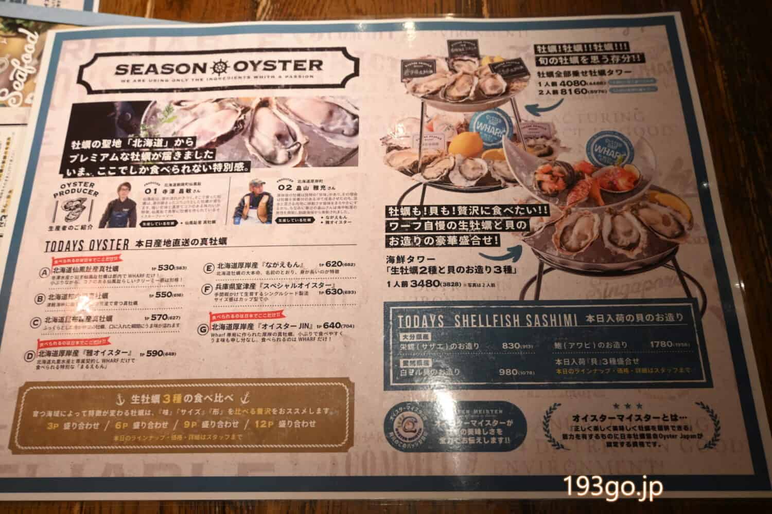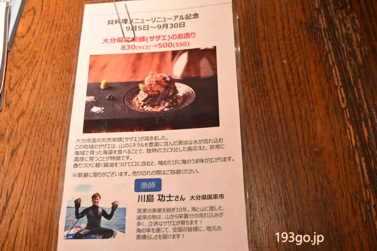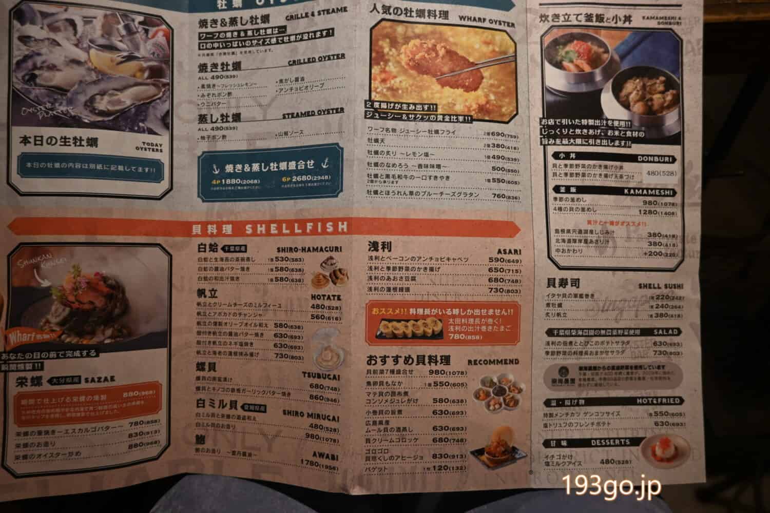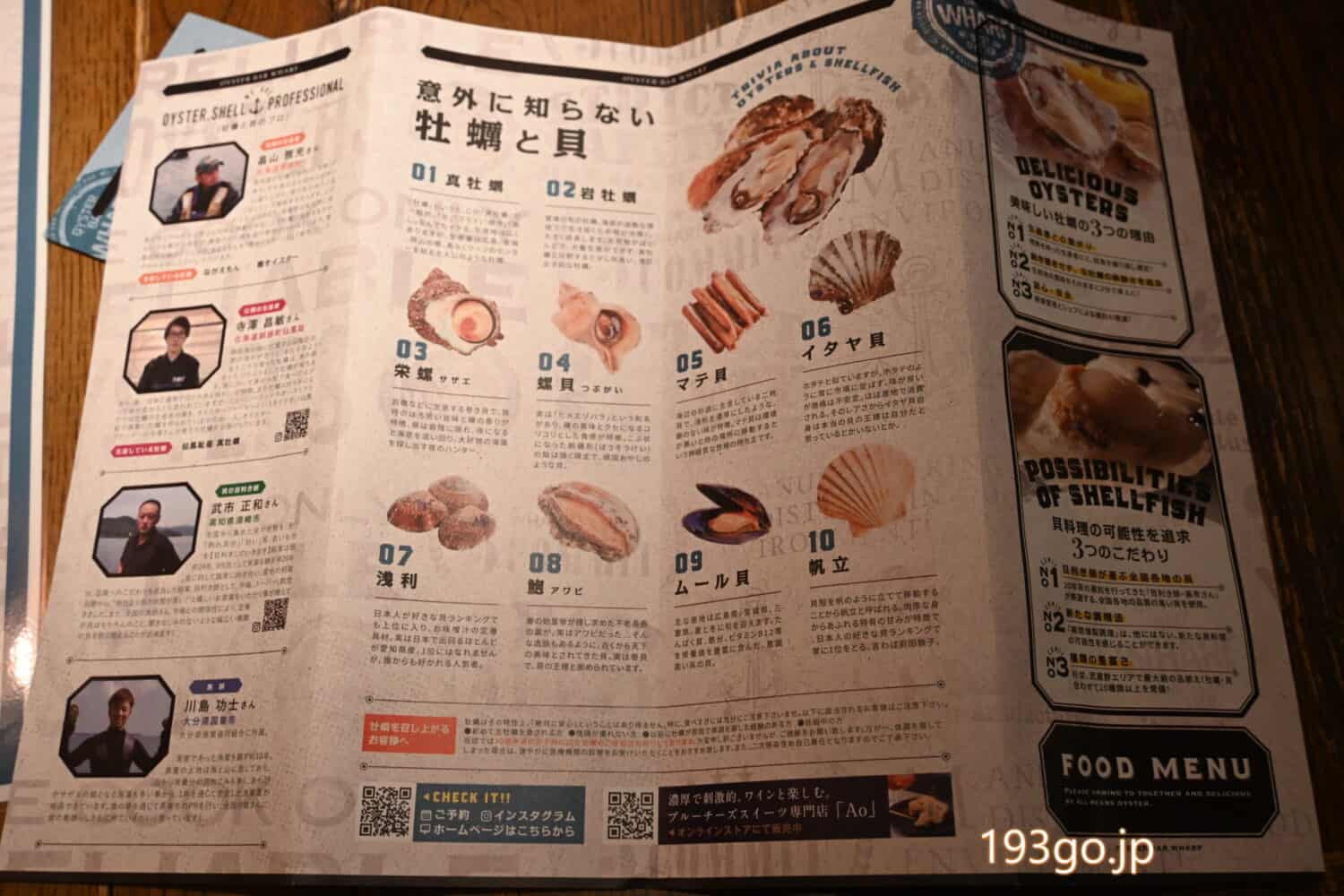 メニューを広げると、貝のお造りに、生カキ、牡蠣フライ、貝寿司、貝の釜めしと貝づくし。