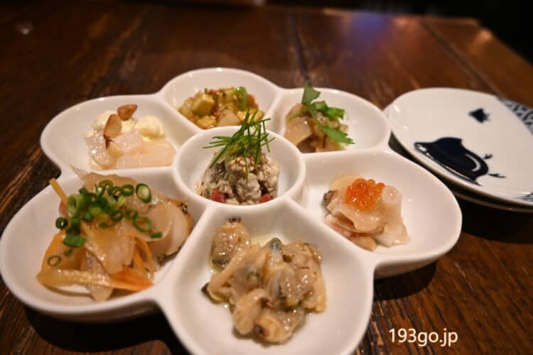中央は牡蠣のなめろう、赤蒟蒻と。