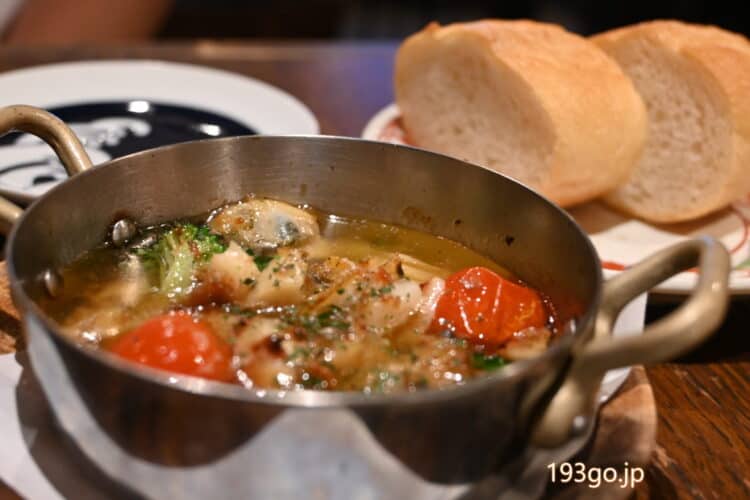 貝のアヒージョには、アサリ、つぶ貝、ベビーホタテ。