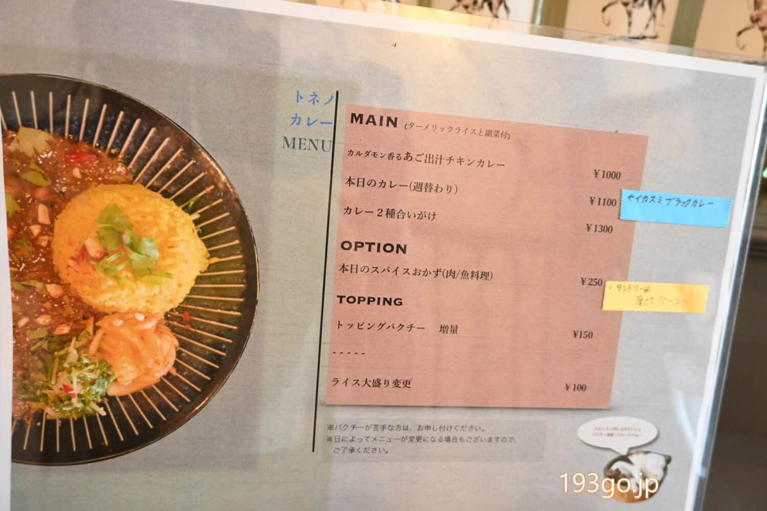 トネノカレー:土日の12:00〜16:00※カレーは無くなり次第終了、営業時間はインスタグラムで更新される。