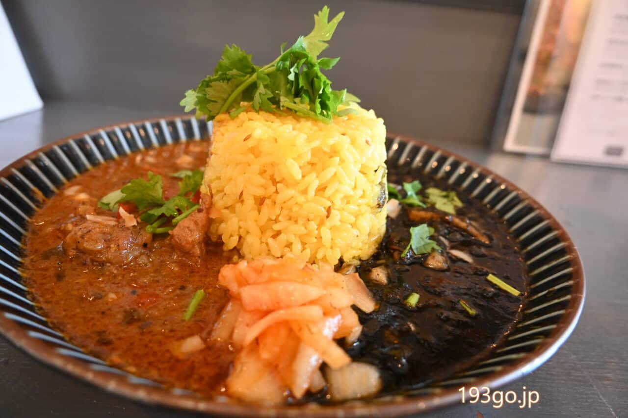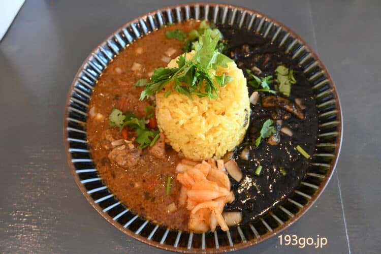 真ん中に高さのあるサフランライス、左側があご出汁チキンカレー、右がイカスミブラックカレーだ。