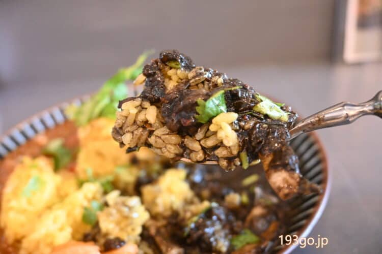 チキンカレーは、イカ墨の方よりピリピリとスパイシー、カルダモンも香る。