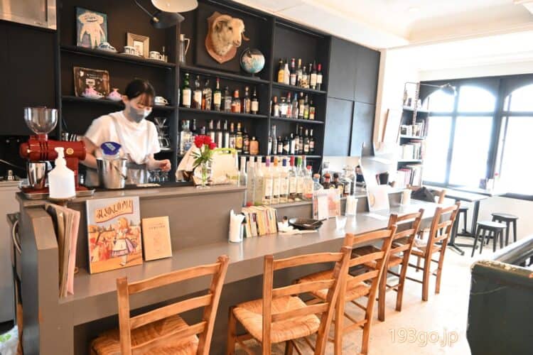 リキュールのボトルが並び、夜はおしゃれなバーに、昼間はカフェの営業。