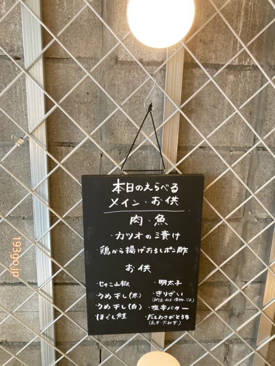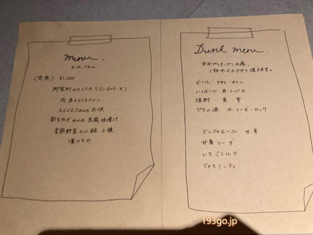 メニュー 定食1,200円。選べるメインとお供、小鉢付き