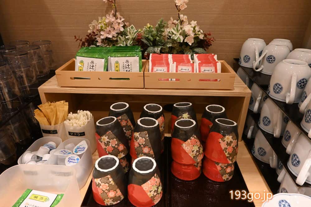 ドリンクバーには、ソフトドリンクとコーヒーマシーン、辻利の煎茶に、紅茶のティーバッグ。