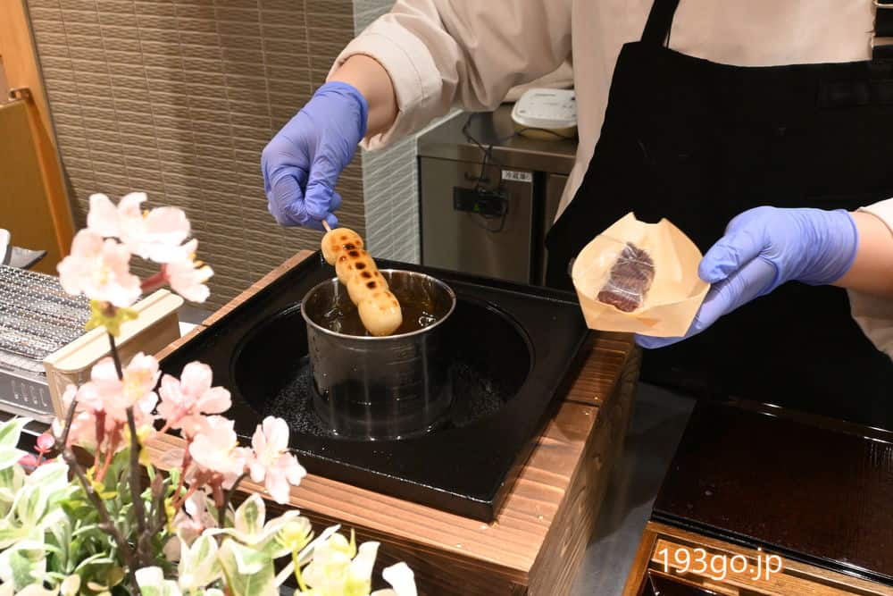 同じグループの共立オアシスが、12月にオープンした「もちかえり処 羽衣茶寮 浅草花やしき通り店」で販売されているお団子。