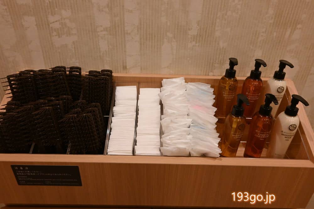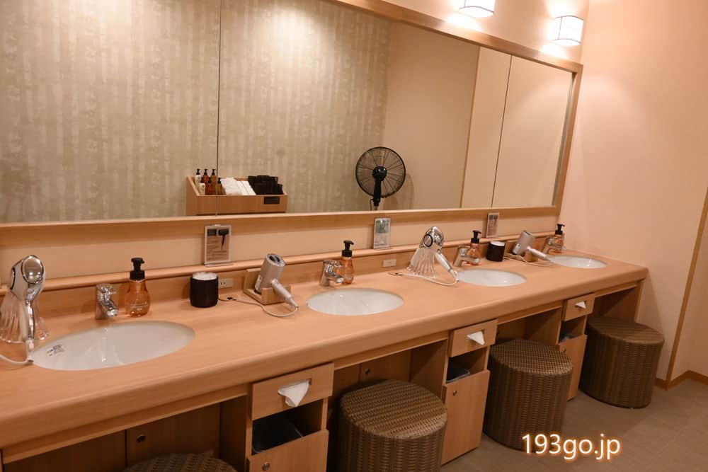 脱衣場に鍵付きロッカー、洗面台、スキンケア用品、アメニティ、ドライヤー(リファ-ReFa)が備わる。