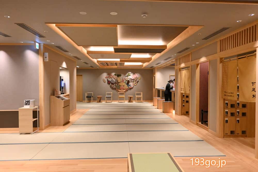木材や畳を用いた広々したロビー(帳場)。天井や壁には浅草にちなんだ江戸を感じるデザインが施されている。