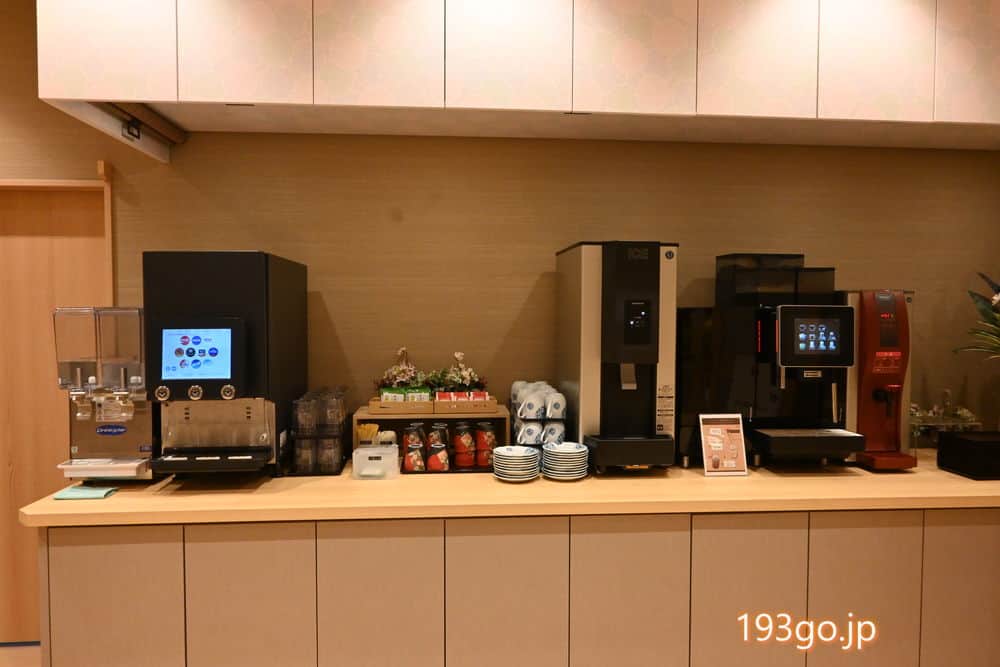 ドリンクバーには、ソフトドリンク、コーヒーマシーン、辻利の煎茶など。おしゃれな和柄の湯呑みで。
