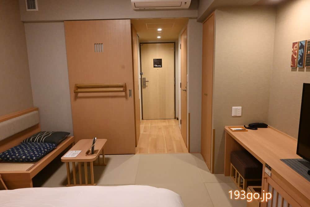 入口はシームレスで広く、シャワー、トイレ、洗面台はそれぞれ独立式で、ベッドルームへの扉もあり、収納、デスクスペース、畳のフロアでくつろぎ。