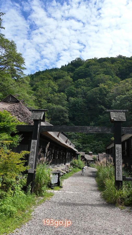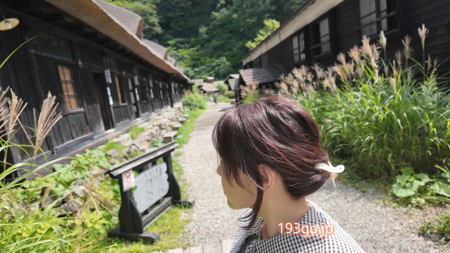 無料駐車場に車を止めて、茅葺屋根の客室や食堂が並ぶ通りを進み、奥の温泉場へ。