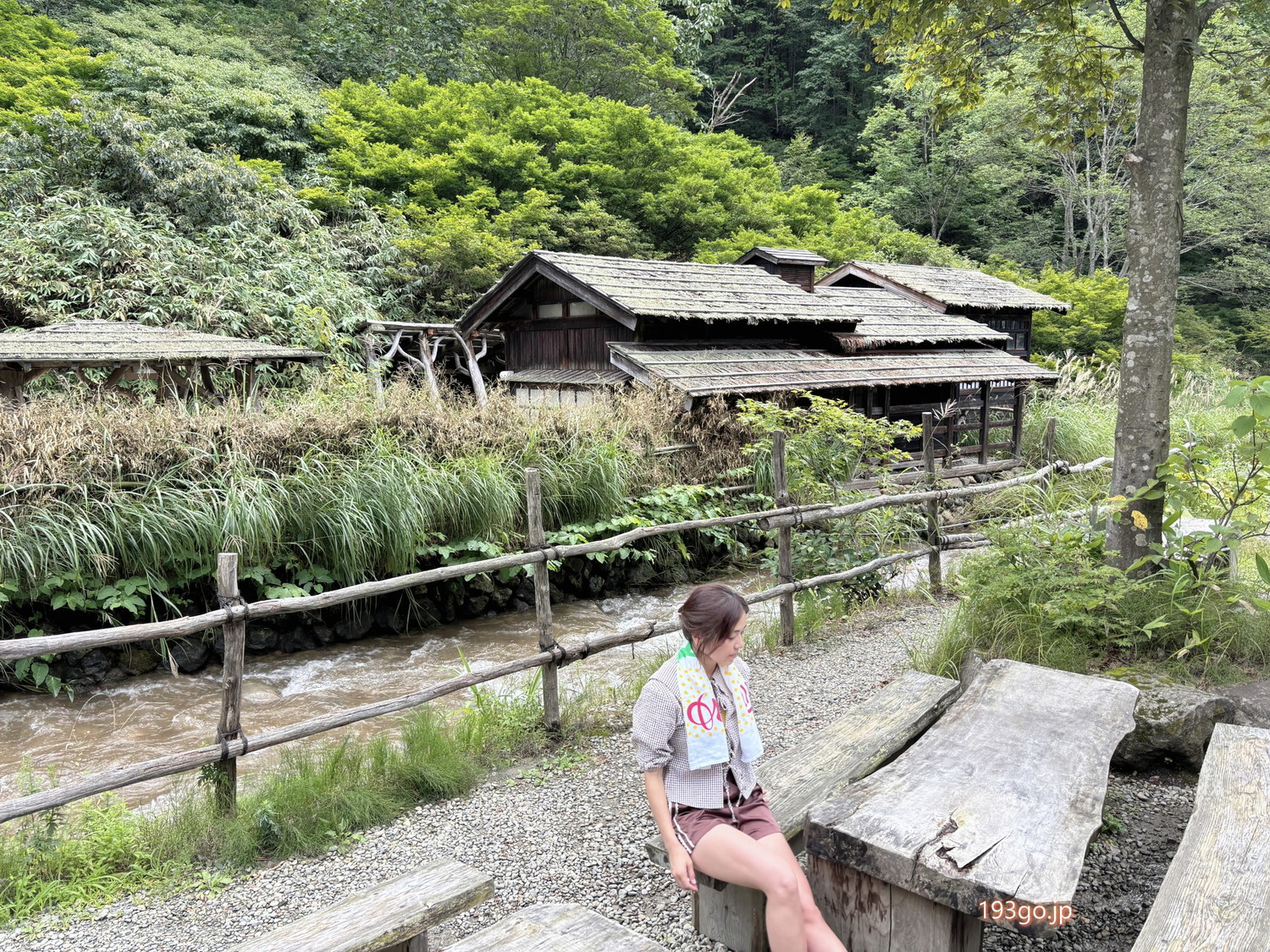 砂利のガタガタ道と渓流が流れる大自然に佇むかやぶき屋根の佇まい、