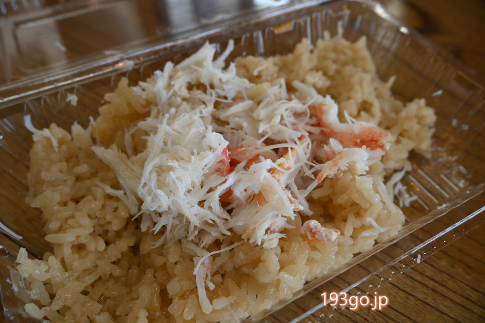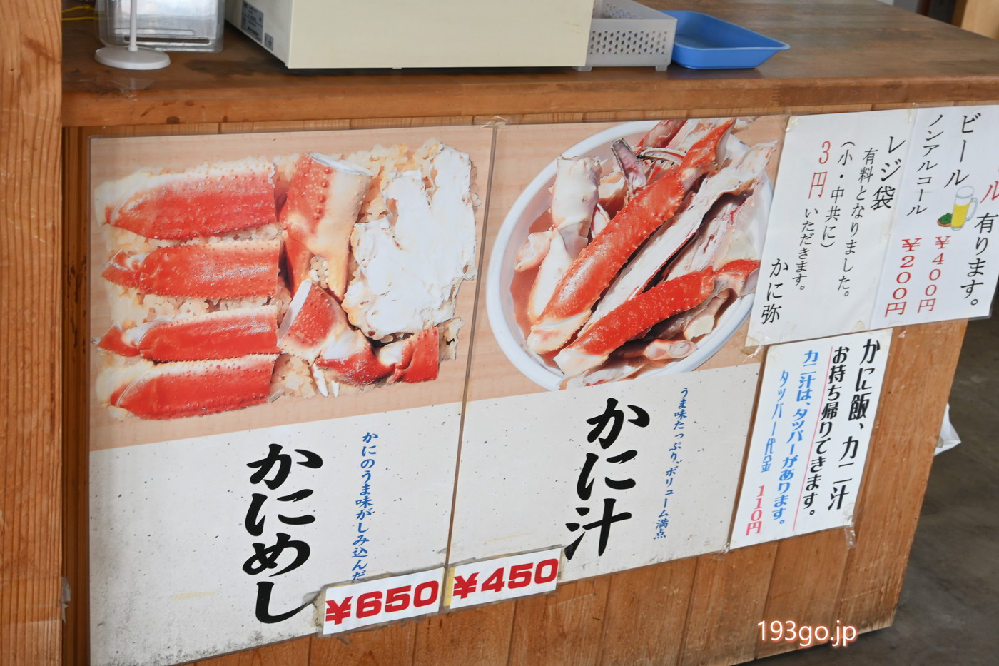店内で食べるメニューはシンプル。かにめし:650円とかに汁:450円。