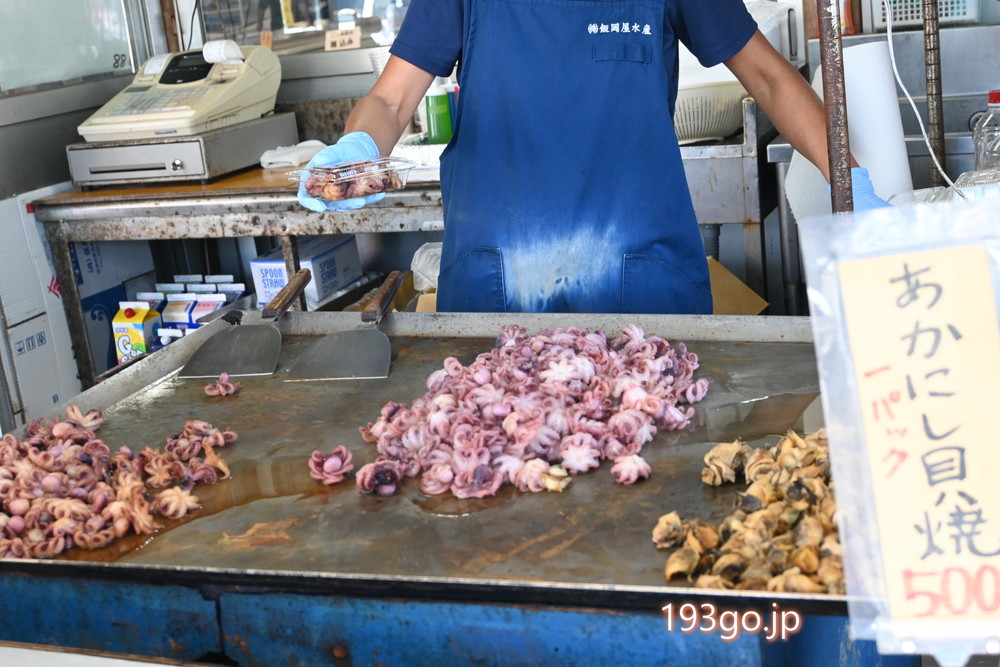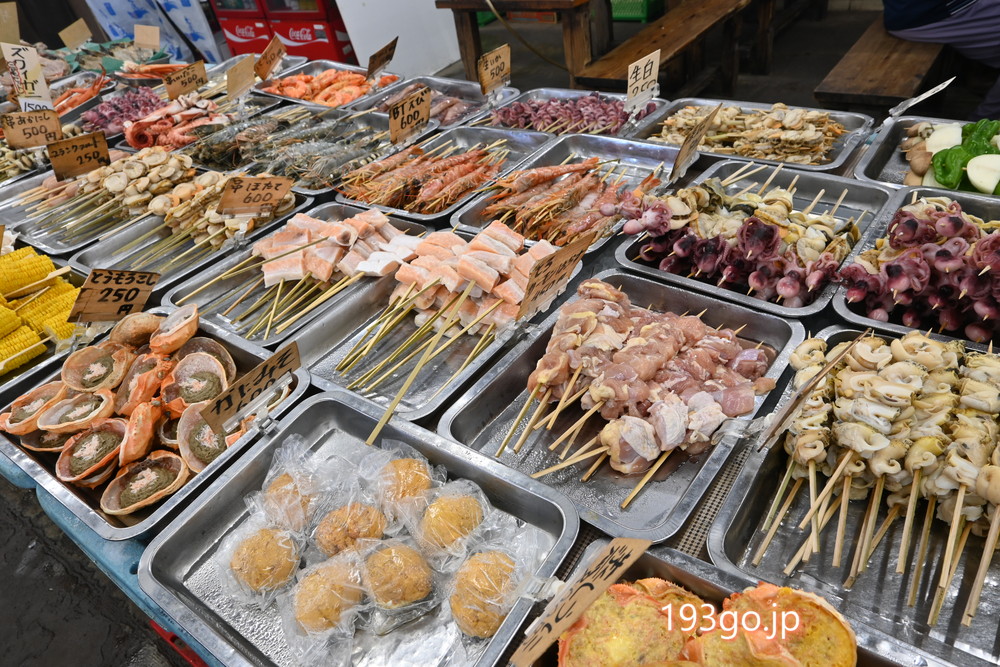 向かいの市場では海鮮串が食べれたり、海産物が売られてる。