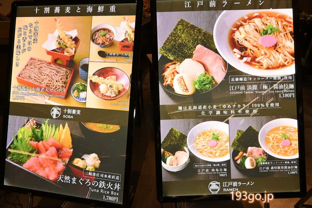 海鮮丼に、江戸前蕎麦、ラーメン、肉料理とカジュアルに楽しめるので、家族連れや、外国人観光客にも人気がありそう。