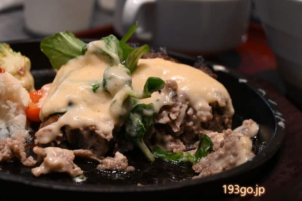 ハンバーグには別添えのアツアツチーズソースをかけていただく。