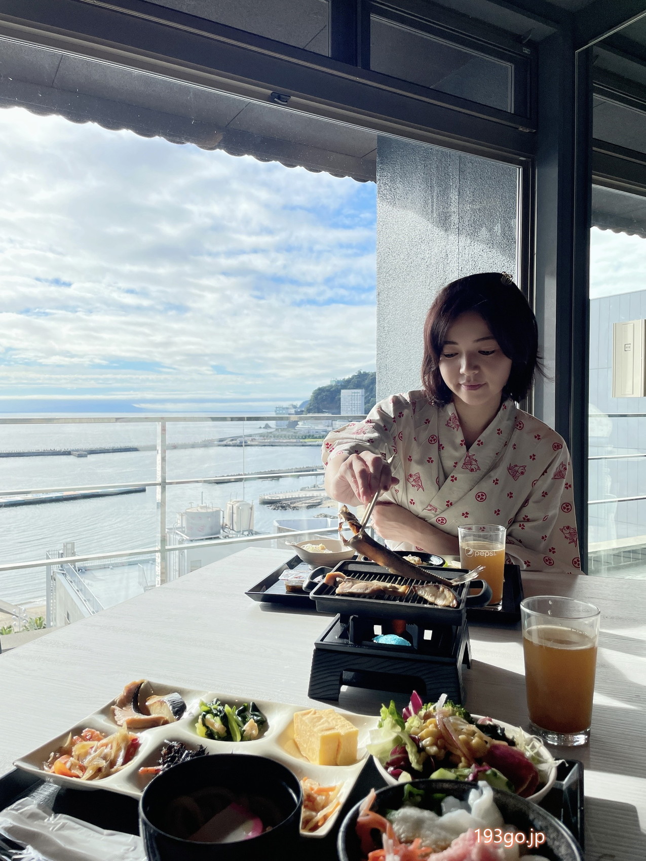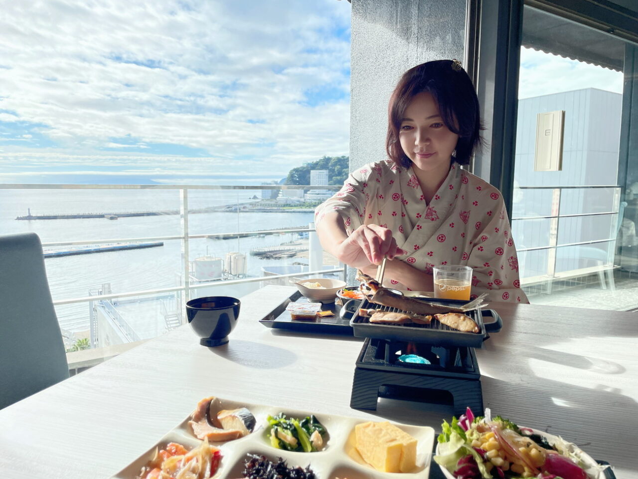 夕食は、錆色とブルーグリーンを基調としたインテリアに囲まれた落ち着いた雰囲気のなか過ごしたので、朝食は熱海の海が一望できる窓辺の席へ。