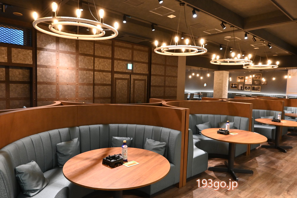 レストランは、まるで船の中にいるかのようなデザインが特徴。壁面は船のドックヤードをイメージした重厚な装飾で、天井から吊り下げられた照明も船舶風のもの。